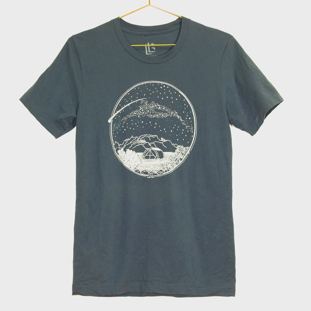 This t-shirt is perfect for anyone who loves spending time in the great outdoors. The white Desert Camping illustration on the front of the ocean blue colored shirt is inspired by chilly, moonless desert nights where countless stars (some of them shooting stars!) fill the sky. The illustration glows in the dark, so you can see it even at night! The shirt is made of soft, breathable 100% cotton and has a comfortable fit making it perfect for a hike, a day spent exploring nature, or enjoying nature at a campsite.