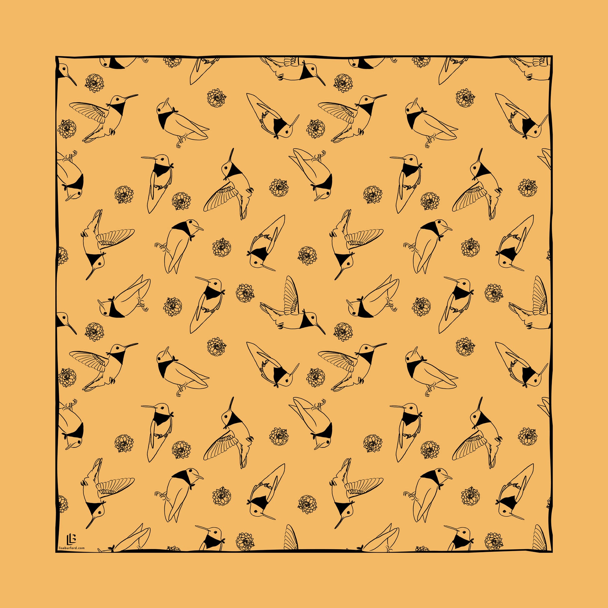 Pattern of hummingbirds wearing their own bandanas screen printed on a 22"x22" gold color bandana. Print is in black.
